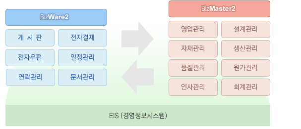 BizWare2는 공지사항, 게시판, 전자우편 등 일반적인 그룹웨어 기능과 ERP와 연동하여 전자결재, 업무관리, 일정관리, 지식관리 등 이 있습니다. BizWare2는 기본 기능에 충실하면서 다양하고 선진화 된 최신 기술환경을 기존 시스템과의 연동을 통하여 통합 시스템 구축을 가능하도록 하였습니다. 기업 내의 컴퓨터 사용자들이 네트워크로 연결된 각 컴퓨터를 통해 문서작성, 결재는 물론, 문서 보관 등의 업무까지 정보화할 수 있게 해드립니다.